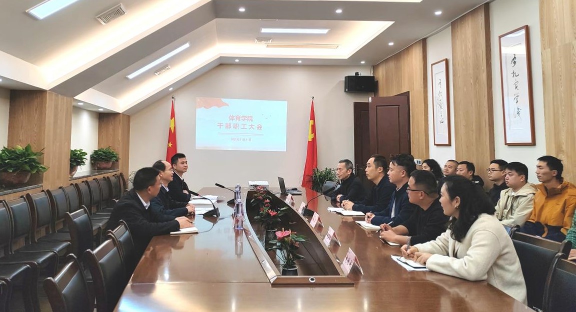 1111日,体育学院在学院会议室召开干部职工会议,宣布学校党委关于体育学院党委书记任免决定。学校党委书记黄涛讲话,党委常委、组织部部长李虎、党委办公室、校办公室副主任杨浩强参加会议。