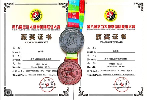 经过三个月的刻苦集训,我校冉卫东老师凭借过硬实力,在强手如林的“一拳一械”个人项目中脱颖而出。其“太乙逍遥掌”招式精准、劲路饱满,于松柔舒缓中尽显太极的圆活与连绵之美,最终斩获二等奖(银牌);“武当太极扇”的表演则流畅圆活,开扇瞬间干净利落、劲发清脆,将武术的刚柔与艺术的美感完美融合,荣获三等奖(铜牌)。